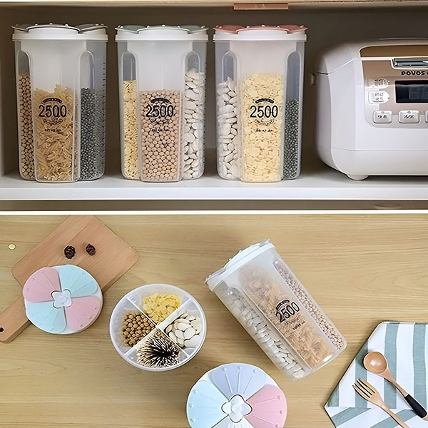 DIVERINO spremnik ima jedinstveni podijeljeni dizajn s 4 pojedinačna odjeljka, održavajući vašu hranu organiziranom i lako dostupnom. Savršeno za žitarice, grickalice, začine i još mnogo toga – recite zbogom neredu u vašoj kuhinji ili hladnjaku!