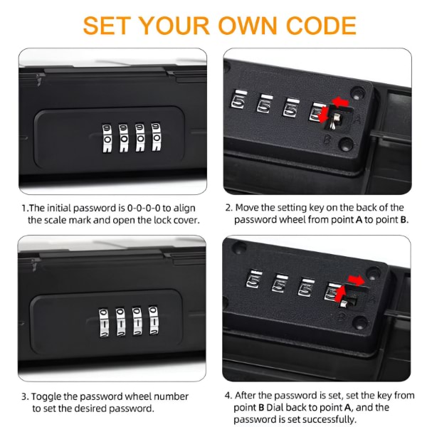 Vaše vrijednosti su sigurne sa SAFORY kutijom s bravom koja ima 4-znamenkasti kod s do 10.000 mogućih kombinacija – mnogo sigurnije od tipičnih modela s 3 znamenke. Mirni ste, bez obzira na to gdje se nalazite.